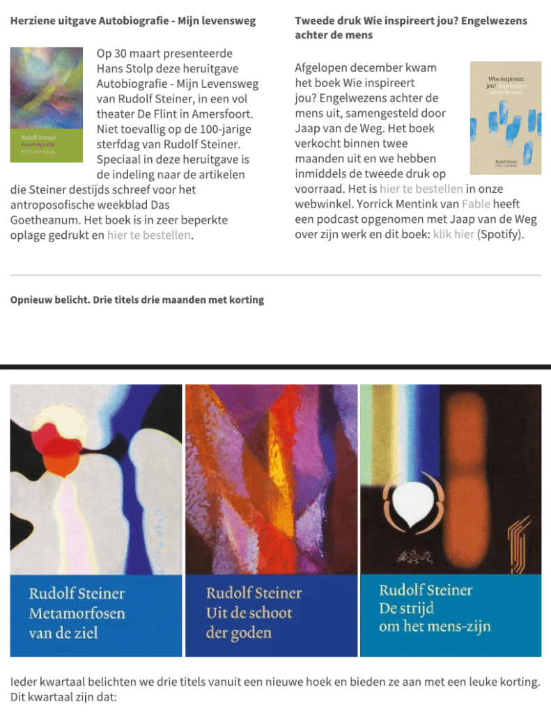 Lees verderIn mei 2025 is de eerste editie van de digitale nieuwsbrief van SteinerVertalingen in een nieuwe huisstijl uitgekomen. Deze zal voortaan vier keer per jaar verschijnen en informeren over de nieuwe uitgaven, achtergronden over de stichting en bijeenkomsten en evenementen waar we je graag ontmoeten.